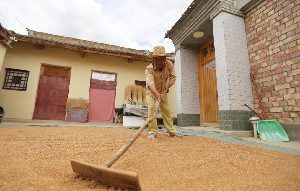 7月1日,通渭影子腔传承人刘满仓在通渭县常家河镇自家院子里晾晒小麦。