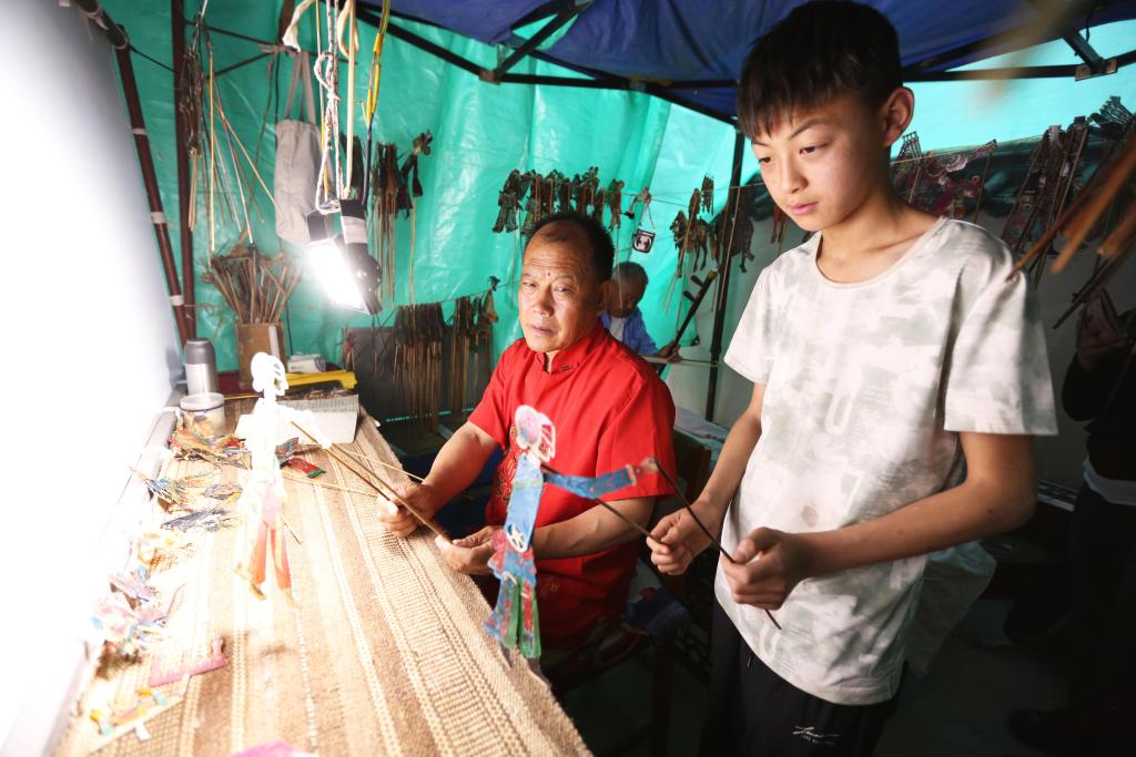 7月1日,在通渭县常家河镇,一名学生在通渭影子腔传承人刘满仓的指导下表演皮影戏。