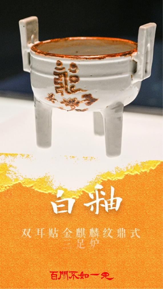 这只白釉双耳贴金麒麟纹鼎式三足炉