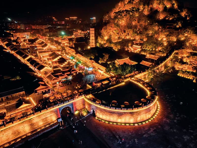 兴善门俯拍紫阳街夜景,城墙上宋韵市集游人如织,紫阳街夜幕里古韵交织 临海市委宣传部供图