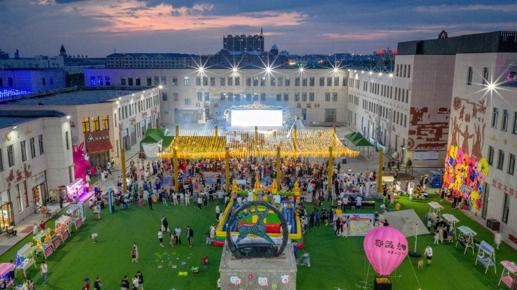 这是7月9日在内蒙古呼伦贝尔市鄂温克族自治旗辉苏木拍摄的“伊德喜”夜市(无人机照片)。