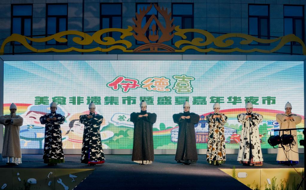 7月9日,在内蒙古呼伦贝尔市鄂温克族自治旗辉苏木,身穿民族服饰的演员在“伊德喜”夜市上表演节目。