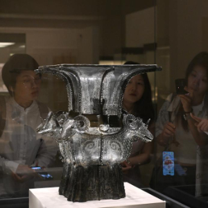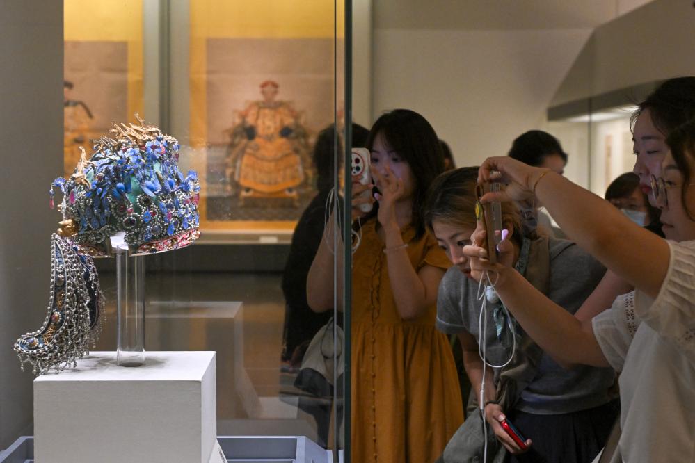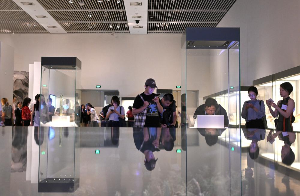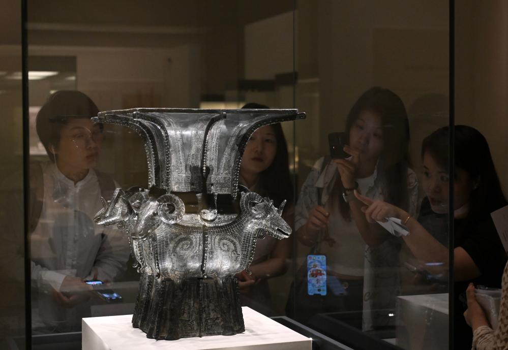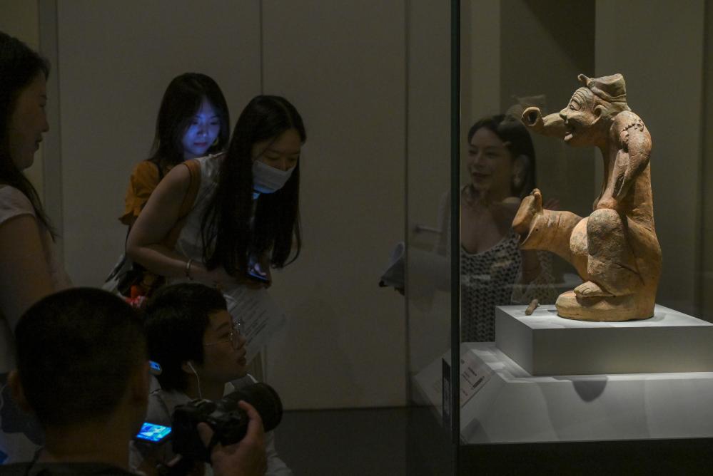7月21日,人们在国博参观仰韶文化鹰形陶鼎。