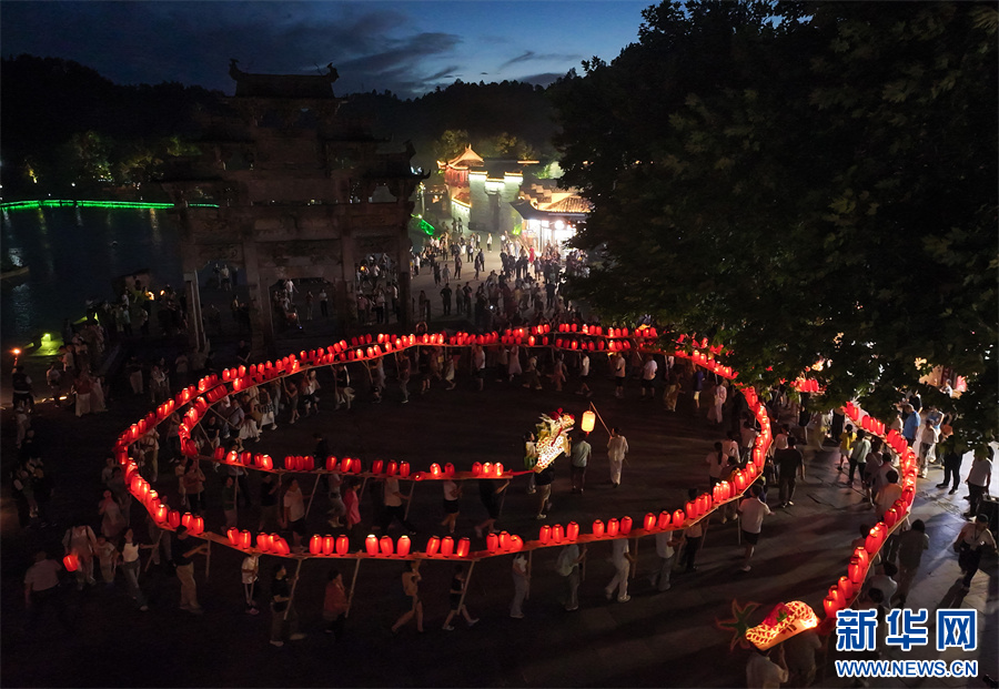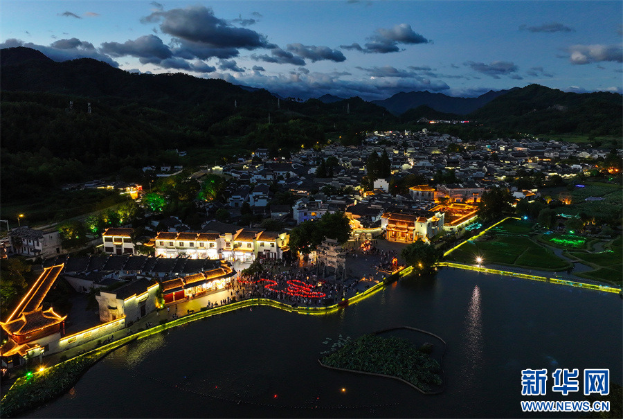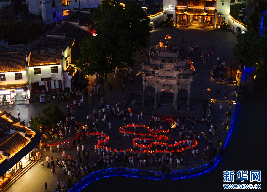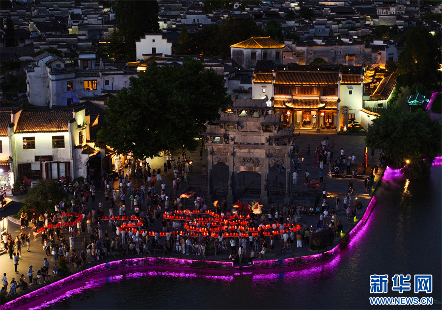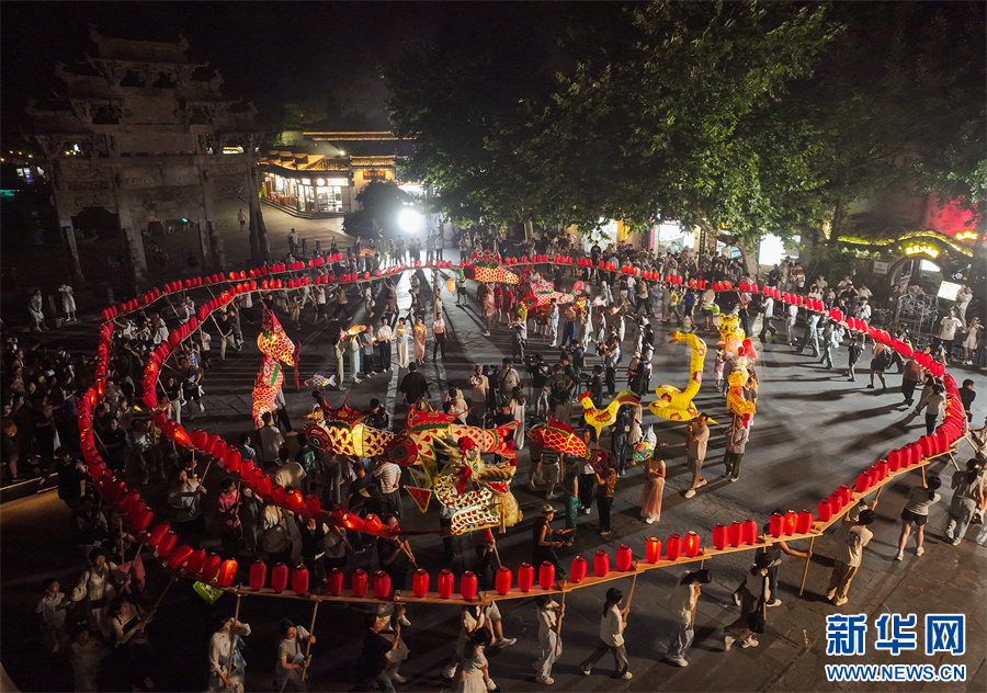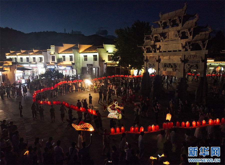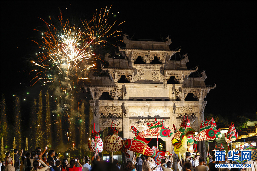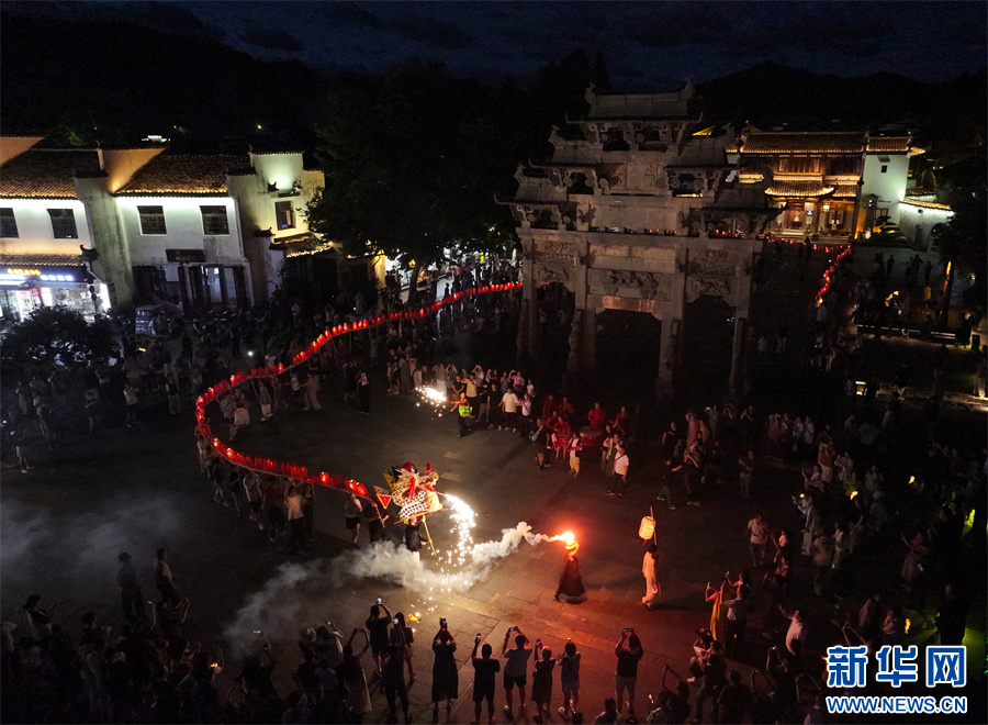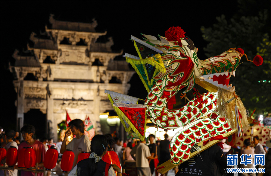 当日,一场热闹非凡的“一夜鱼龙舞”民俗表演在世界文化遗产地安徽省黄山市黟县西递古村落火热上演。游客和村民一同舞动着板凳龙和鱼灯,蜿蜒穿行于粉墙黛瓦之间,点亮千年古村夜色。新华网发(施亚磊 摄)