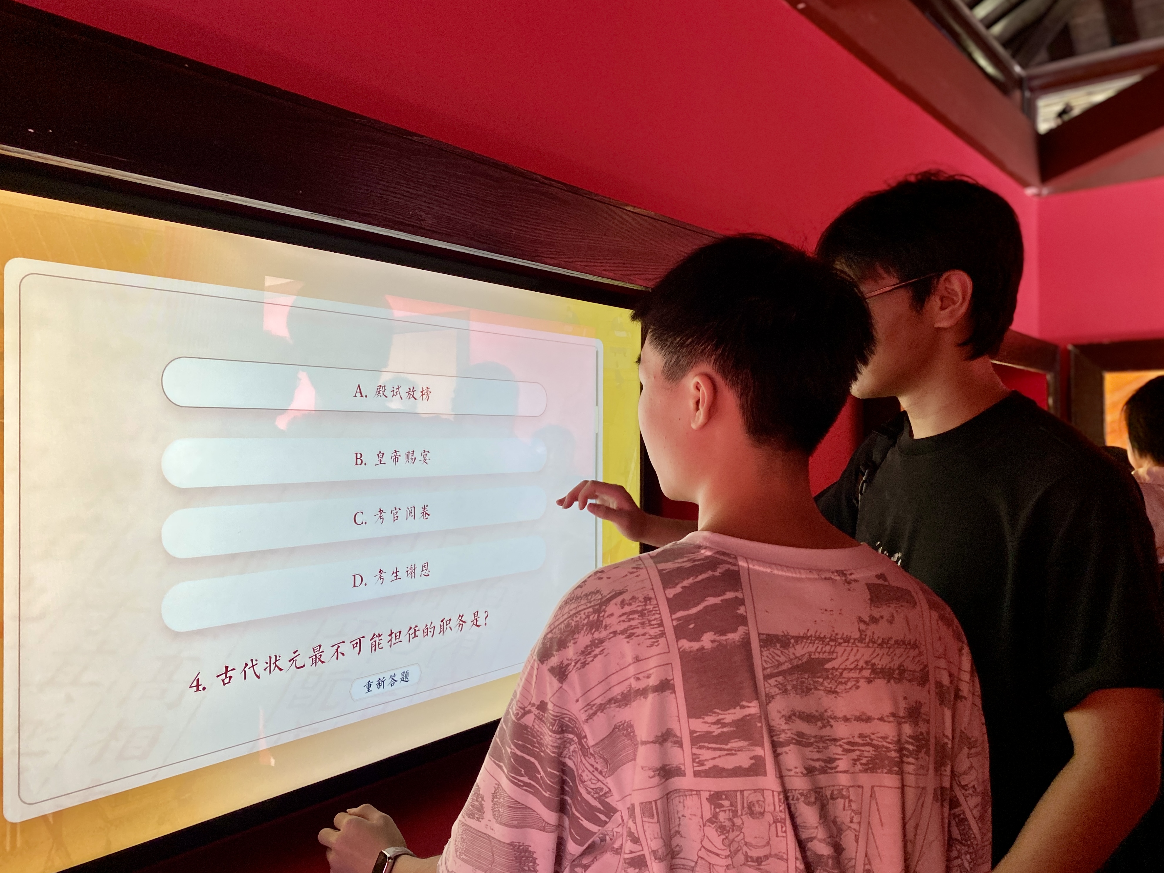 此外,“金榜题名”互动展项以“科举取士”的传统仪轨为原型,融合触屏交互、即时评分等技术,学生通过触屏选择答案,答题结束后,系统会根据正确率即时评定“状元”“榜眼”“探花”的等级,实现从“机械答题”到“文化浸润”的升级。(付远书)