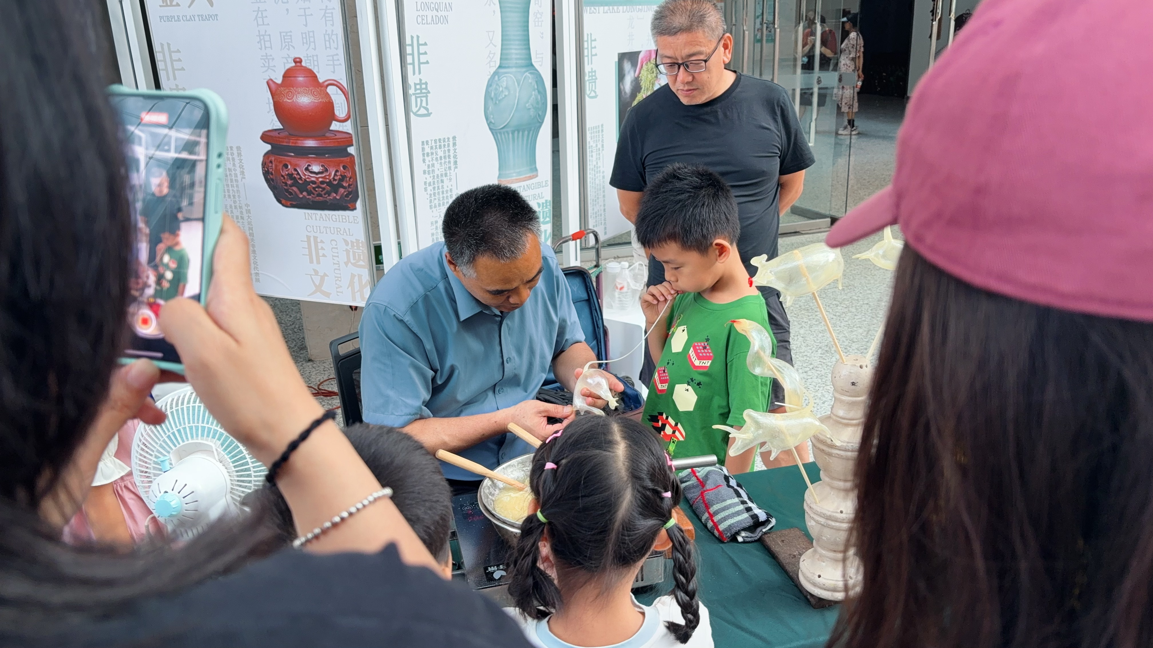 当天,在郑州图书馆现场,还特设运河主题文化市集。首都图书馆、郑州图书馆、北京古代建筑博物馆等单位的众多特色文创品在现场展出。市集中的沉浸工坊前,读者可以亲身体验糖人、糖画、木版年画制作、剪纸和古琴演奏。