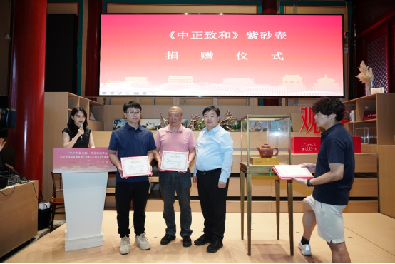 紫砂国礼的登场将活动推向高潮。中国工艺美术大师鲍利安将一把特大尺寸的“中正致和”紫砂壶捐赠给中轴线基金会,秘书长梅松向鲍利安颁发了荣誉证书。