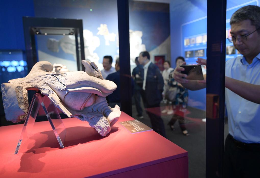 7月28日,观众在欣赏拍摄出土于雄安古州城遗址的唐代龙首。