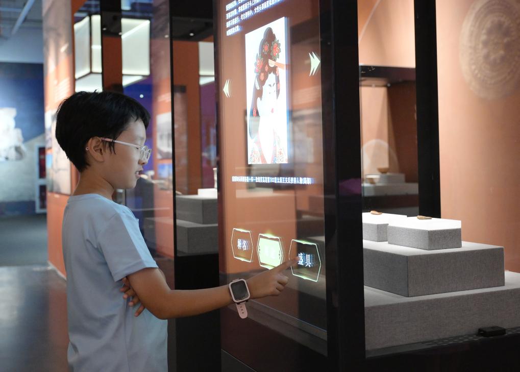 7月28日,一名小朋友在展厅内体验文物智能展柜。