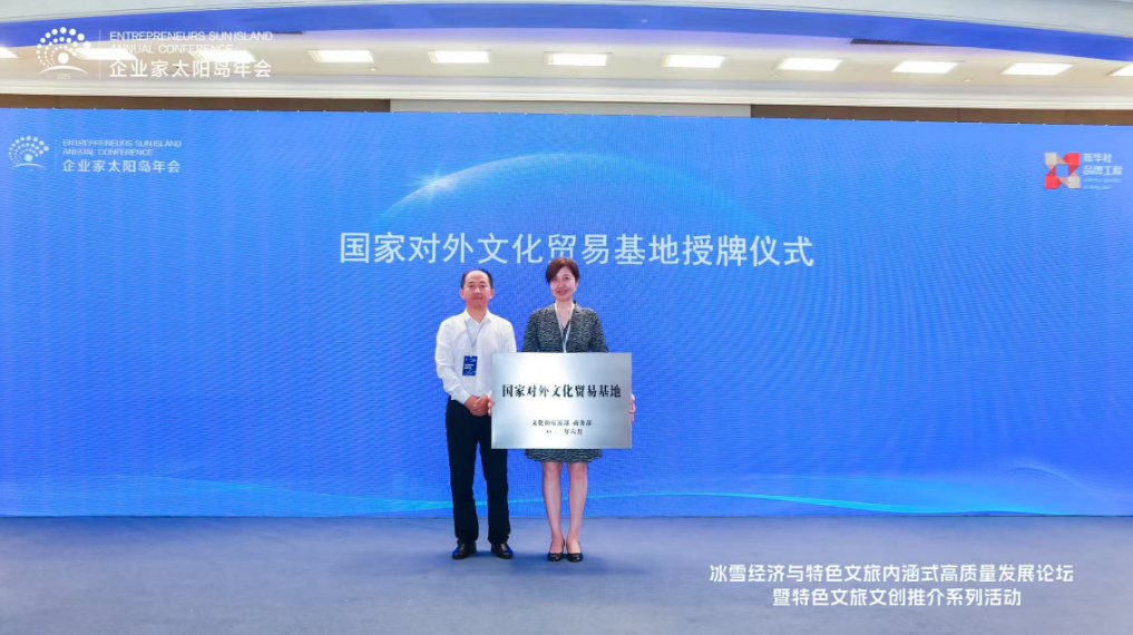 8月2日,2025太阳岛企业家年会“冰雪赋能发展 文旅创引未来”冰雪经济与特色文旅内涵式高质量发展论坛在哈尔滨举行。图为黑龙江省文化和旅游厅副厅长蒋兴成为轩辕集团副董事长王辉授“国家对外文化贸易基地”牌