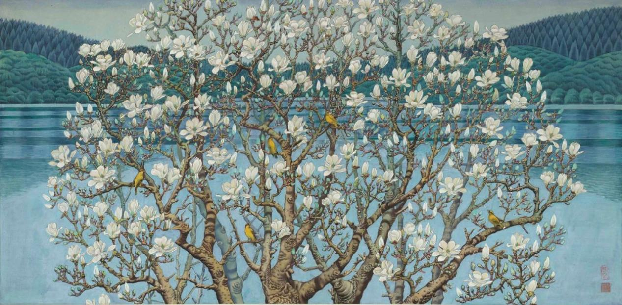《玉兰花开》纸本重彩 52cm×110cm 1976年