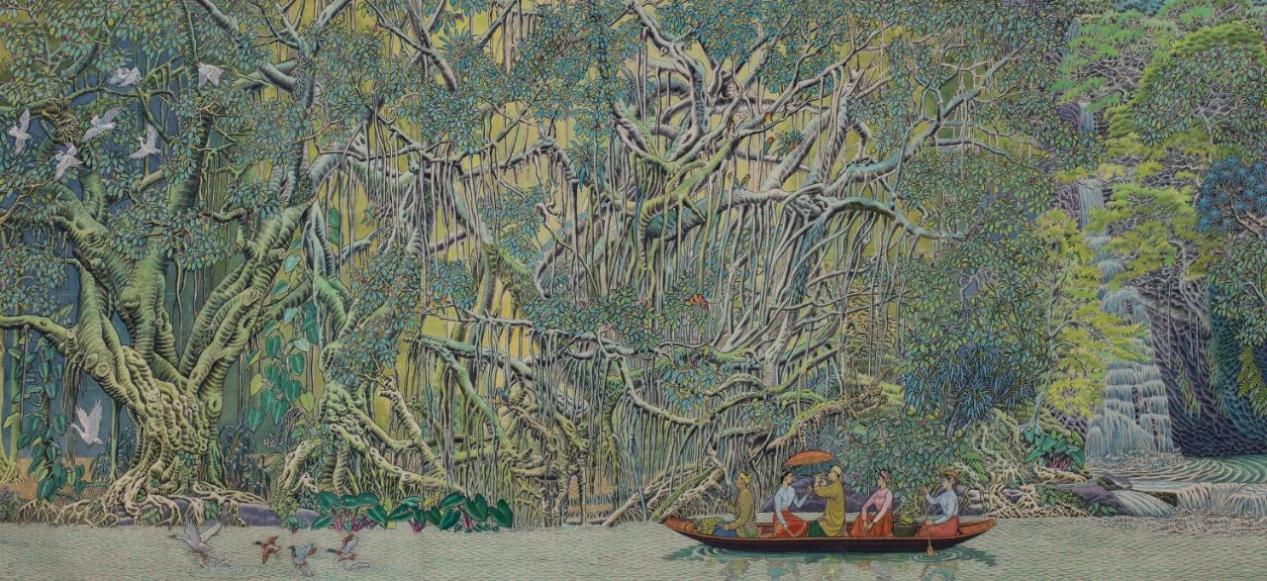 展览围绕祝大年三件重要代表作品《森林之歌》《玉兰花开》《鸢飞曲(风筝节)》展开,通过对作品中所蕴含的声音意象,从形式主义分析出发,强调其工笔重彩的纹样、色彩、构图等视觉特质。从祝大年装饰性艺术语言为切入点,以三大乐章:“自然华章”“生命时序”“人间节律”为叙事结构,即从宏观自然空间到微观生命时空,从自然生命到人类活动,人作为自然的参与者贯穿整个主线,构成“天-地-人”的完整叙事链,呈现其艺术中的东方美学之境。