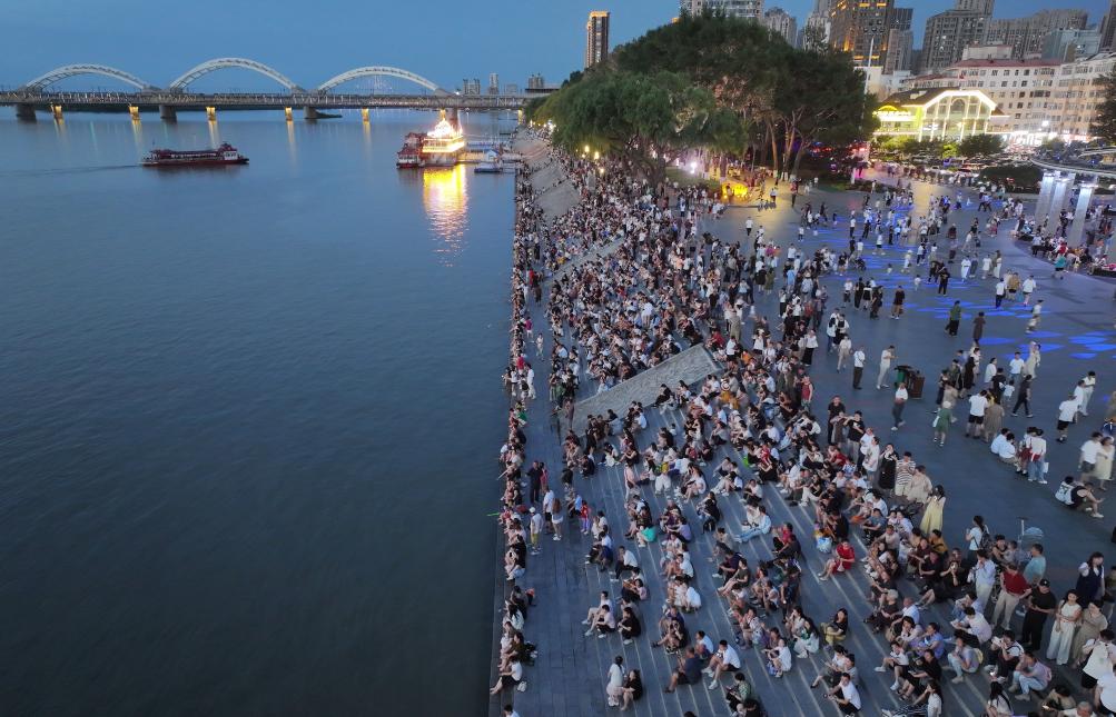 7月25日,在哈尔滨市防洪纪念塔前的江边,人们坐在台阶上休闲纳凉,观赏江景(无人机照片)。新华社发(张树摄)