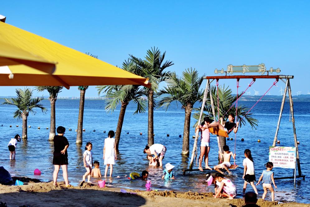 人们在哈尔滨市松花江畔戏水游玩(7月6日,无人机照片)。新华社发(杨威摄) 视频:新华社记者王松