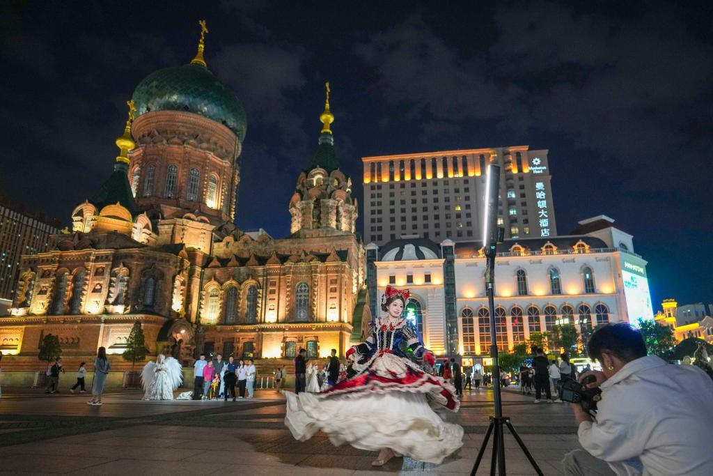 游客在哈尔滨建筑艺术广场盛装拍照(6月8日摄)。新华社记者 王建威 摄