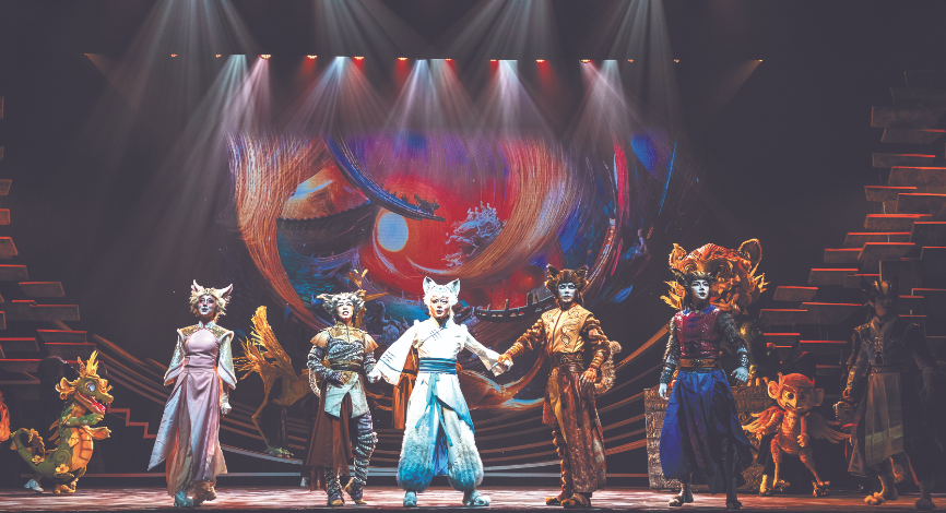 该剧以传统文化为底色。故宫是中国传统文化的代表性符号,其建筑、文物甚至一草一木都记录着百年光阴。舞台上,我们不仅看到鲜活的小精灵,还能看到红墙琉璃瓦、屋檐神兽、青花瓷罐等,它们仿佛也会说话,担忧被小耗子啃伤、被猫咪推倒。这些演绎让文物“活”了起来。作为歌舞剧,其音乐创作也贯彻这一理念。三弦配合京韵大鼓和北京琴书,娓娓道来故宫时光流转;高潮时,京剧和昆曲元素烘托气氛;俏皮搞怪环节配上摇滚乐和节奏布鲁斯,让观众忍俊不禁,也让紫禁城的小猫有了国际视野。