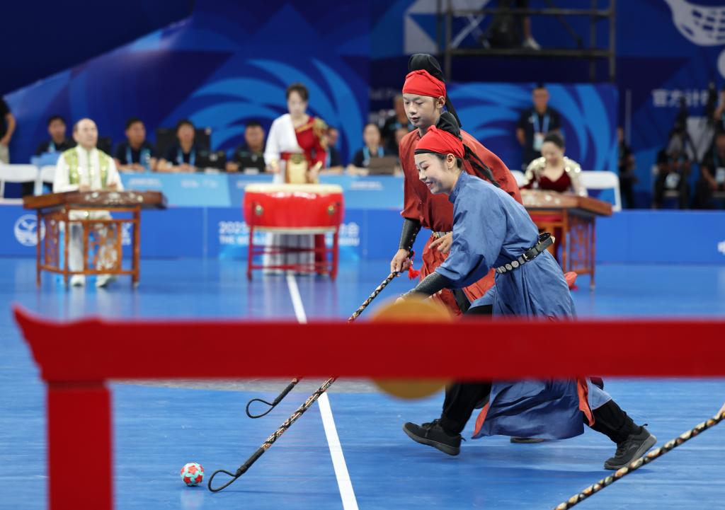世运会不仅是竞技的赛场,更是文明互鉴的窗口。8月6日,软式曲棍球项目开赛。正式比赛之前,一场别开生面的“比赛”率先上演。循着鼓点、琴声,演员们身着唐装球衣竞逐竹编彩球,一场金堂非遗步打球表演,将现场观众带回到盛唐场景。