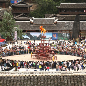 高台狮舞是彭水民间独具特色的传统舞蹈。方桌搭台,少则24张方桌7层台,多则108张方桌18层台,舞狮者需在高台上完成蹬腿、翻滚、立桩等高难度动作。