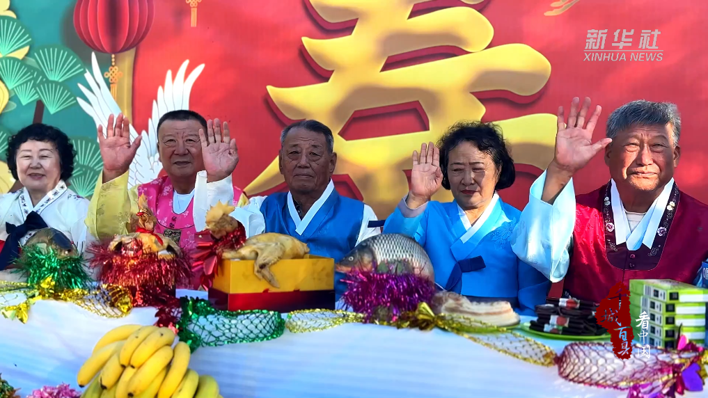 伴着婉转的朝鲜族民谣,几位身着传统服饰的年轻人手持鼓槌,敲响了长鼓。鼓槌起落间,韵律与热情在空气中蔓延。老人们面前的长桌也是仪式感满满,处处透着朝鲜族的礼仪与祝福。油亮鲜香的整鸡、肥美的鲤鱼、雪白软糯的米糕,以及桃子、葡萄等时令鲜果,满满一桌丰盛的食物,每一道都是晚辈对长辈沉甸甸的孝心与敬意。仪式中,花甲老人坐在寿席中央,子女、亲戚等晚辈依次向老人们敬献寿酒、磕头礼拜,祝福老人健康长寿。
