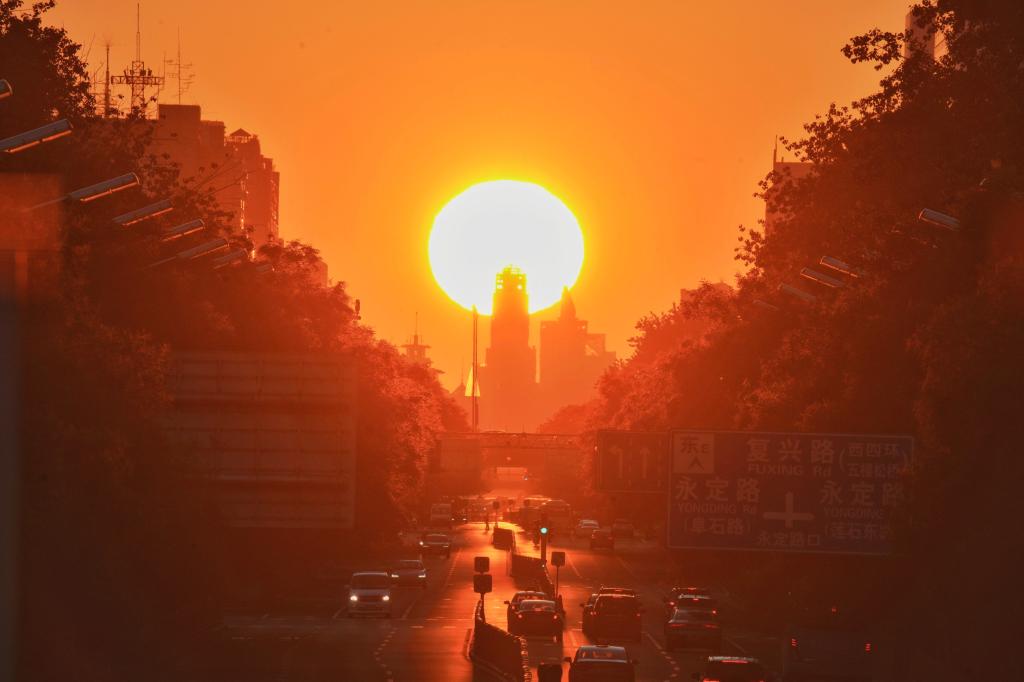 何为“悬日”?顾名思义,就是悬在地平线上方的太阳。“这是一种自然现象,指的是特定日期的日出或日落时,太阳正好位于东西向街道的尽头,仿佛悬挂在地平线上。这一现象理论上可以发生在任何一个街道为东西向、且尽头地平线视野不受阻碍的城市中。”中国天文学会会员、天文科普专家修立鹏说。