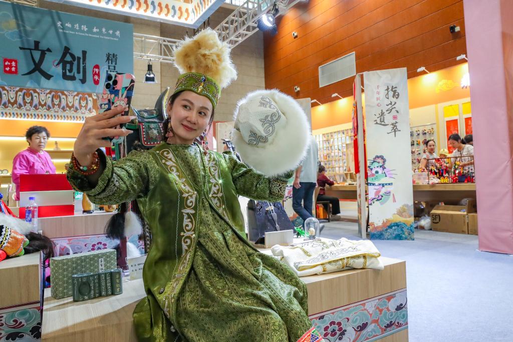 9月22日,游客在敦煌文博会上的一个展览现场身穿民族服饰自拍。