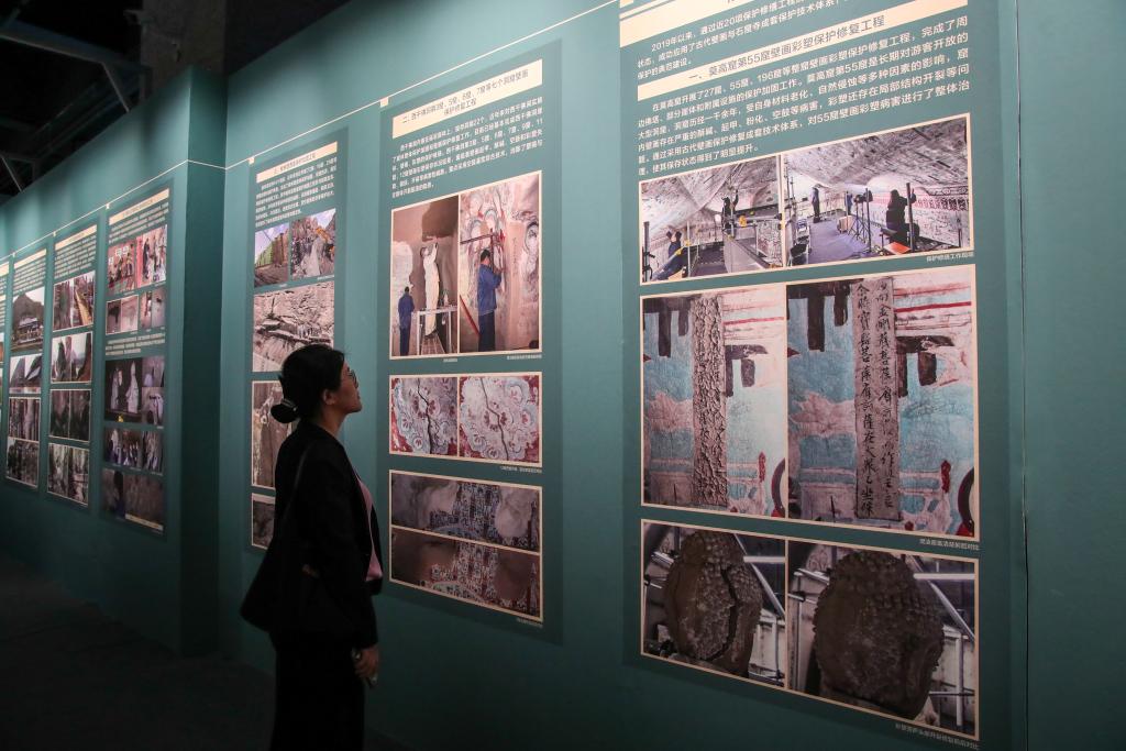 9月22日,在敦煌研究院“典范”“高地”建设成果展上,一名嘉宾在观看莫高窟壁画彩塑保护修复工程简介。