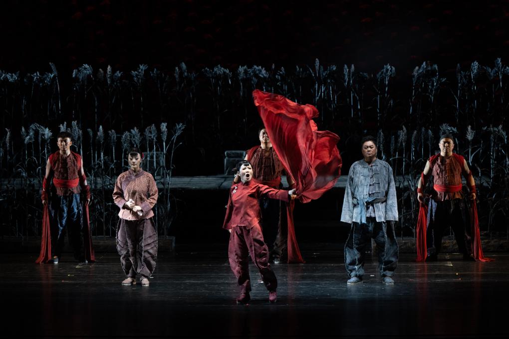 新华社北京9月28日电(记者宋依黛、杨淑君)一声唢呐划破剧场寂静,在急促音符中,一顶花轿缓缓登场,盖着红盖头的九儿静立在红色灯光中……9月27日晚,国家大剧院原创民族歌剧《红高粱》迎来首演,以艺术之名回望浴血岁月,用歌剧之声传承伟大抗战精神。
