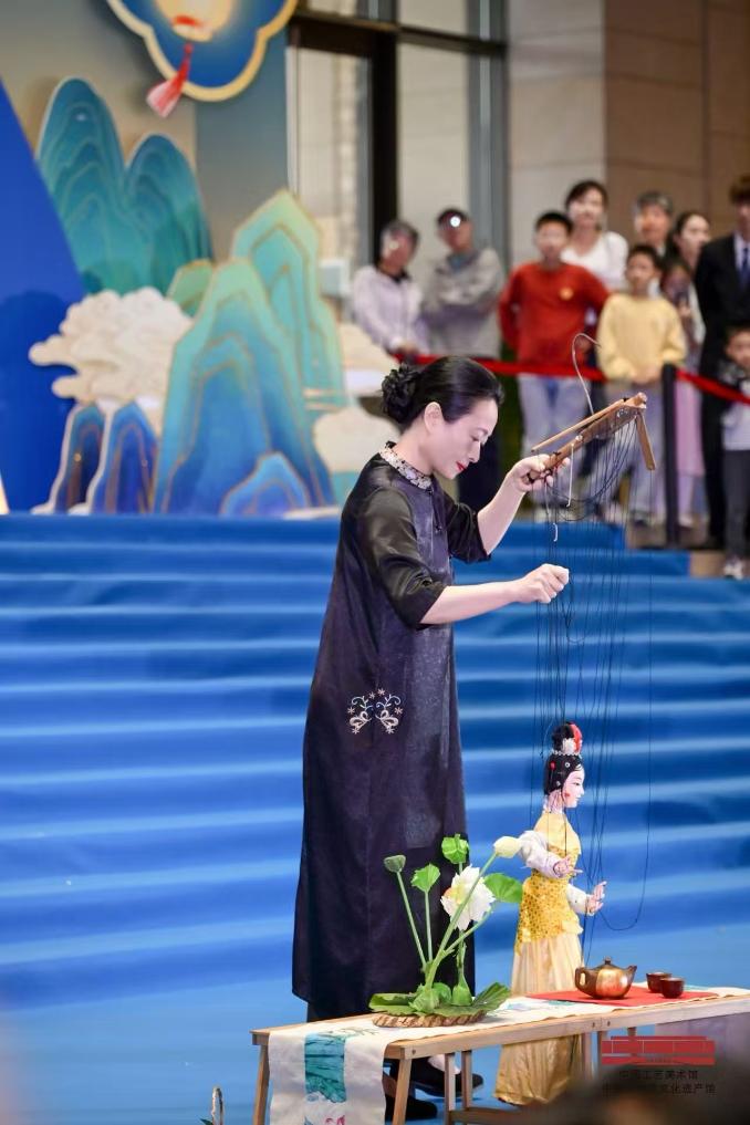 除互动体验活动外,中央大厅全天开展的泉州提线木偶表演让观众大饱眼福。舞台上,传承人指尖轻提细线,木偶灵动演绎出嫦娥在月宫俯瞰人间美景的片段,细腻的动作、鲜活的神态,让木偶仿佛拥有生命。