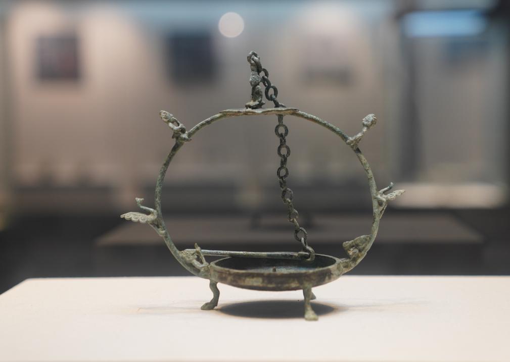 这是10月21日在广西合浦汉代文化博物馆拍摄的活链提梁铜灯。
