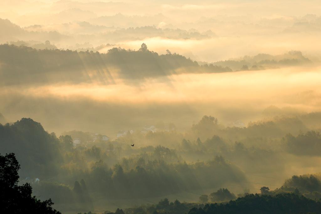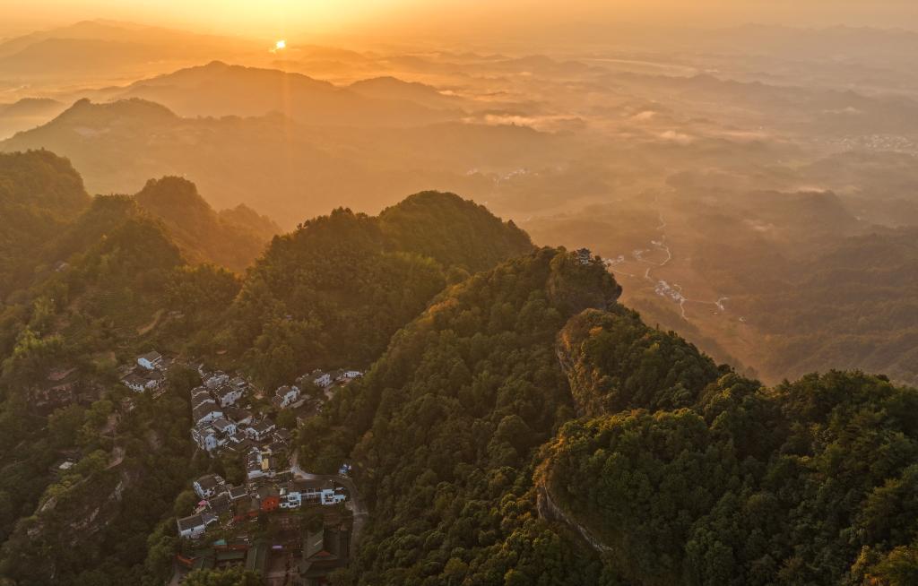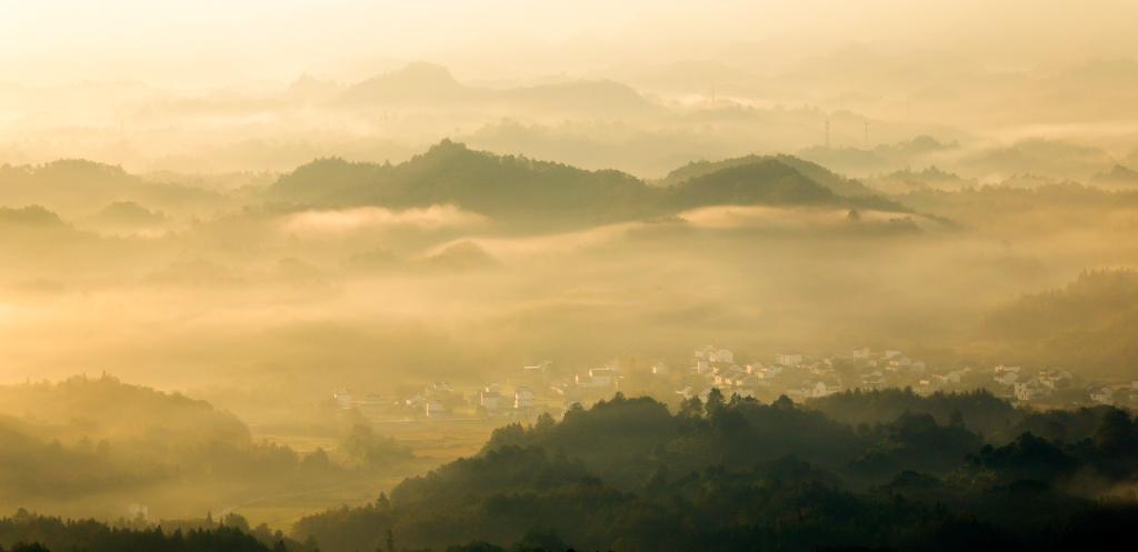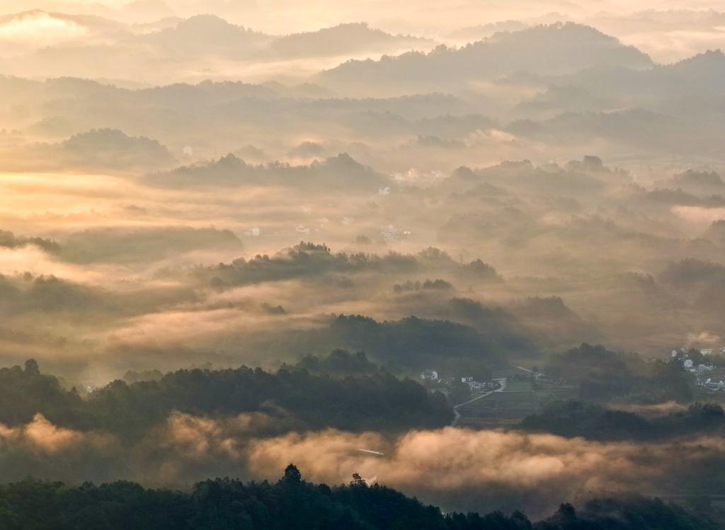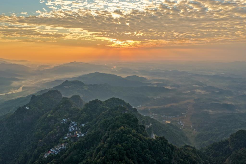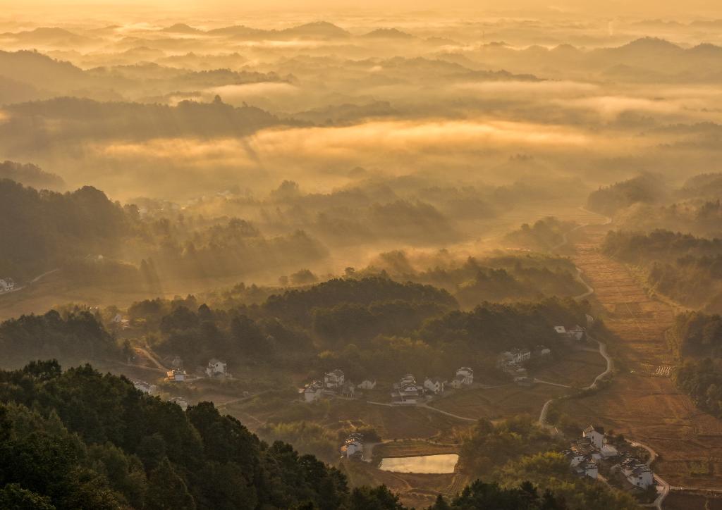 秋日清晨,安徽省黄山市休宁县齐云山云雾轻盈缭绕,山峦与田园在云纱中若隐若现,宛如一幅浑然天成的水墨画卷。