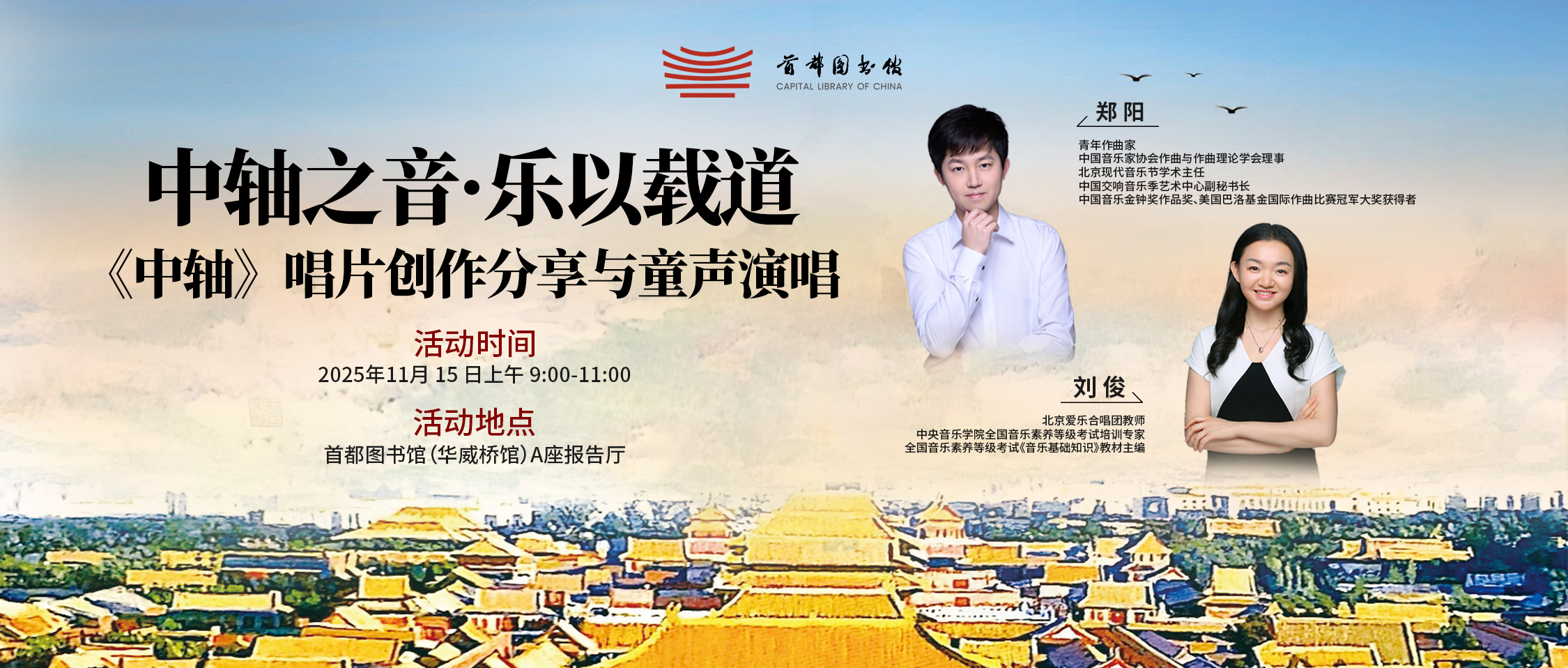 首都图书馆以馆藏文献资源《中轴》黑胶唱片为依托,将于11 月 15日9时在华威桥馆 A 座报告厅举办“中轴之音・乐以载道:《中轴》唱片创作分享与童声演唱”活动。