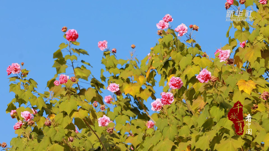 木芙蓉花朵在阳光照耀下晶莹剔透,宛如云霞铺展。清风拂过,树叶和枝条轻响,仿佛为初冬谱写了一曲温柔的“冬日序曲”。