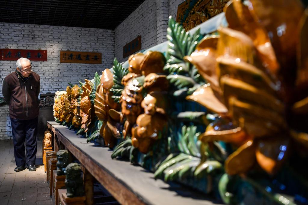 这是11月18日在山西省介休市后土庙拍摄的古建顶上的装饰构件。孔雀蓝、翡翠绿、琥珀黄……