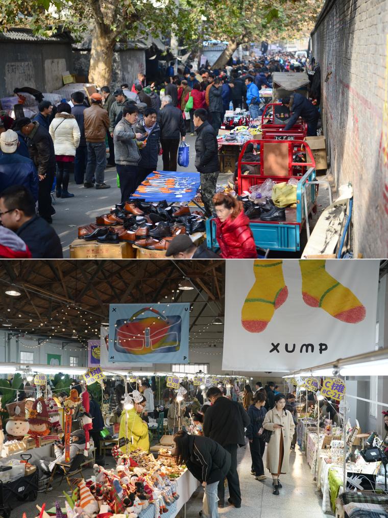 拼版照片:上图为游客在位于西安市莲湖区的老西仓市集上选购商品(2016年12月1日摄);下图为游客在改造后的西安西仓市集文创公园一处市集上选购商品(2025年12月6日摄)。