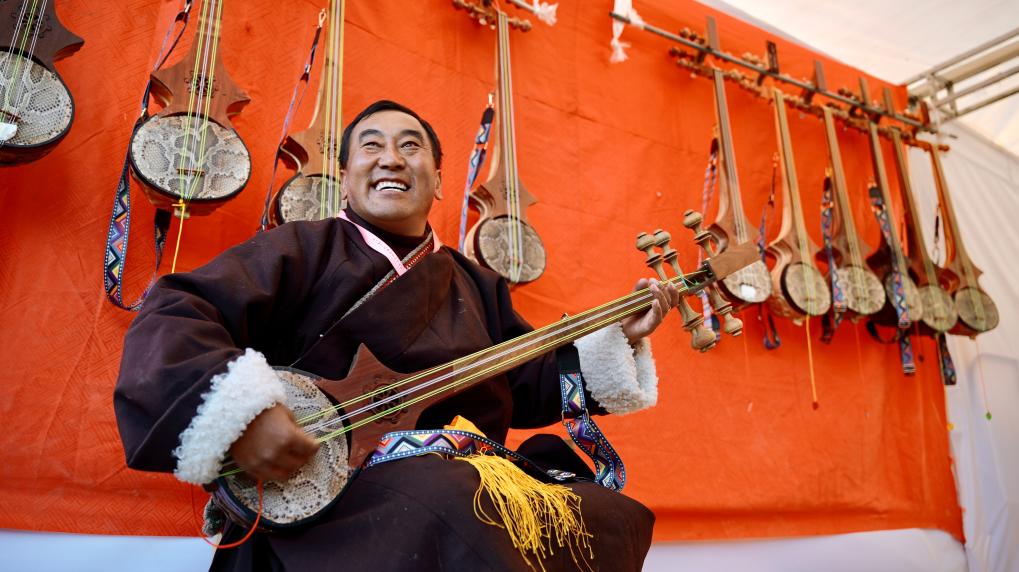 来自曲松县朱麦沙村的洛桑曲扎,在摊位前弹起自己手工制作的扎念琴,悦耳的琴声吸引人们纷纷停下脚步。