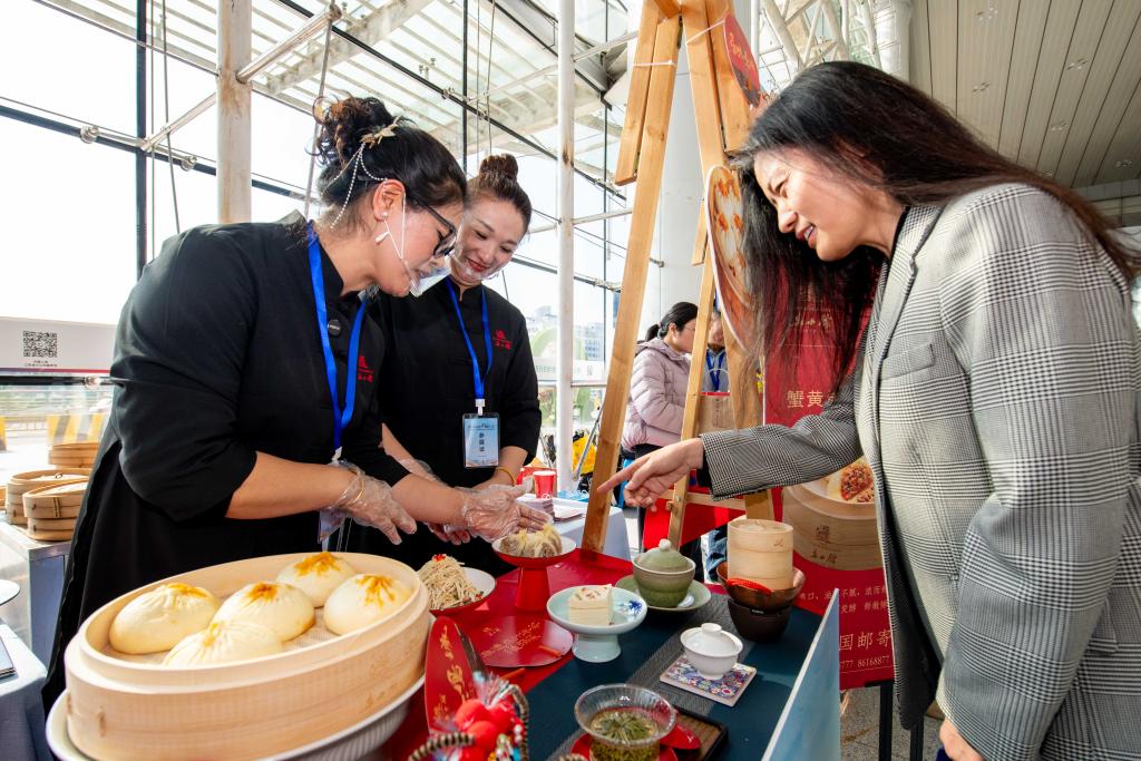 12月5日,工作人员在泰州站给旅客介绍泰州早茶。