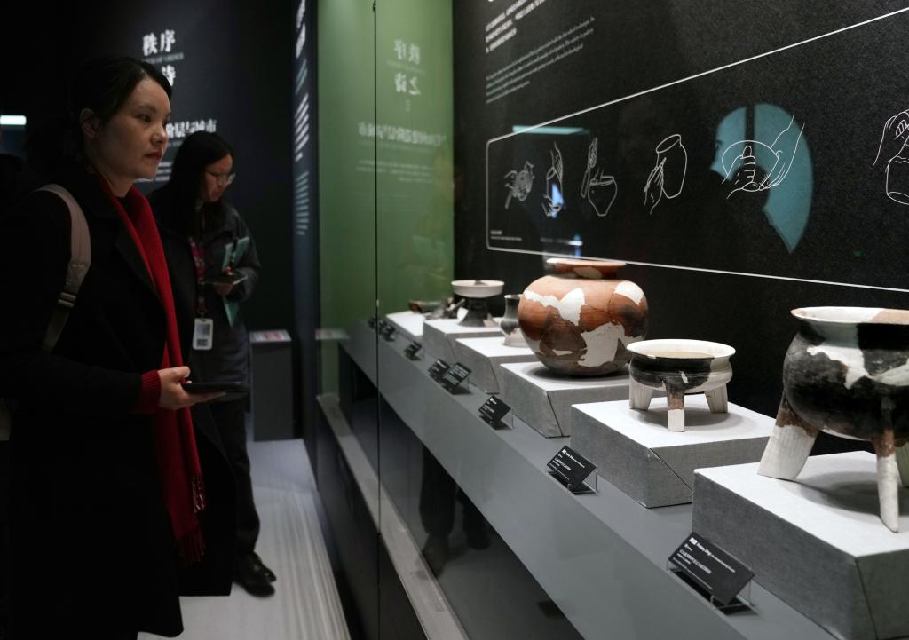 12月12日,参加媒体预览的人员在观看良渚文化陶器。