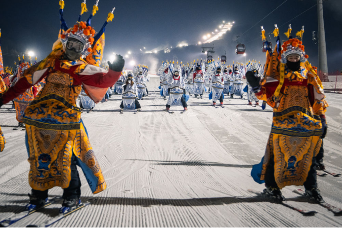11月21日,滑雪者身着京剧服饰在中旅松花湖度假区进行滑雪表演。新华社记者许畅摄