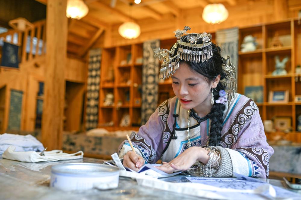 在贵州省黎平县肇兴侗寨侗品源传统工艺农民专业合作社,游客在体验蜡染技艺(12月19日摄)。