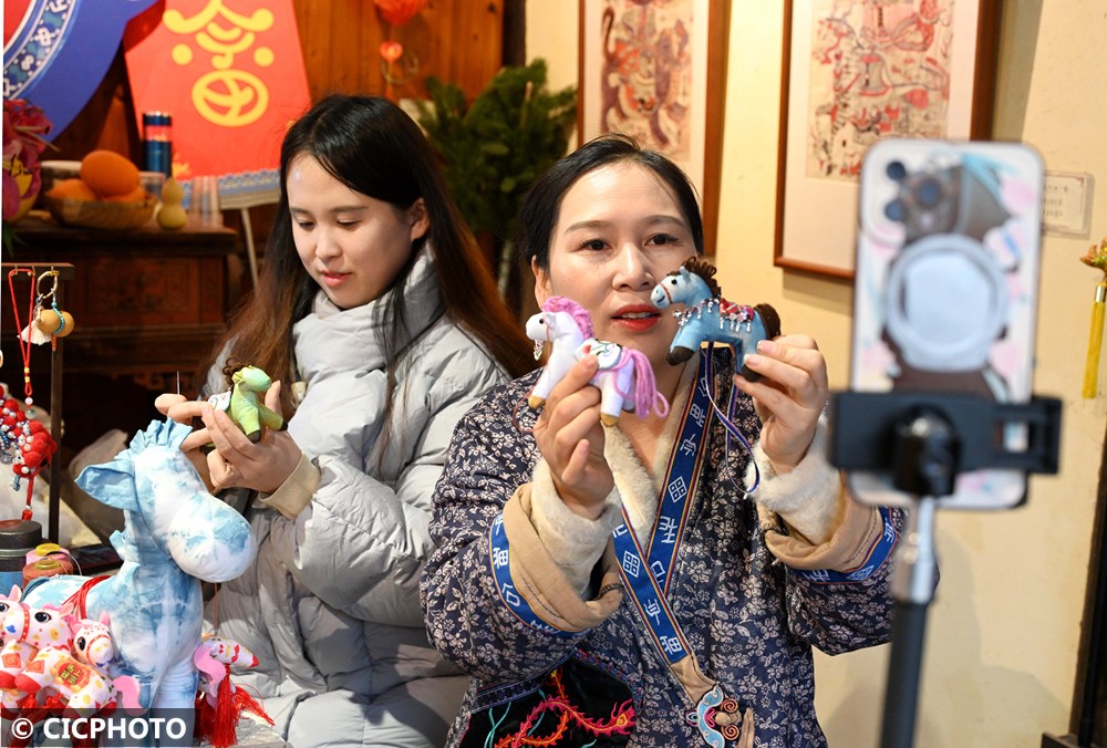 ↑2025年12月24日,浙江省金华市武义县履坦镇坛头村一家共富工坊的工作人员通过手机直播销售手工制作的马年生肖饰品。CICPHOTO/张建成 摄
