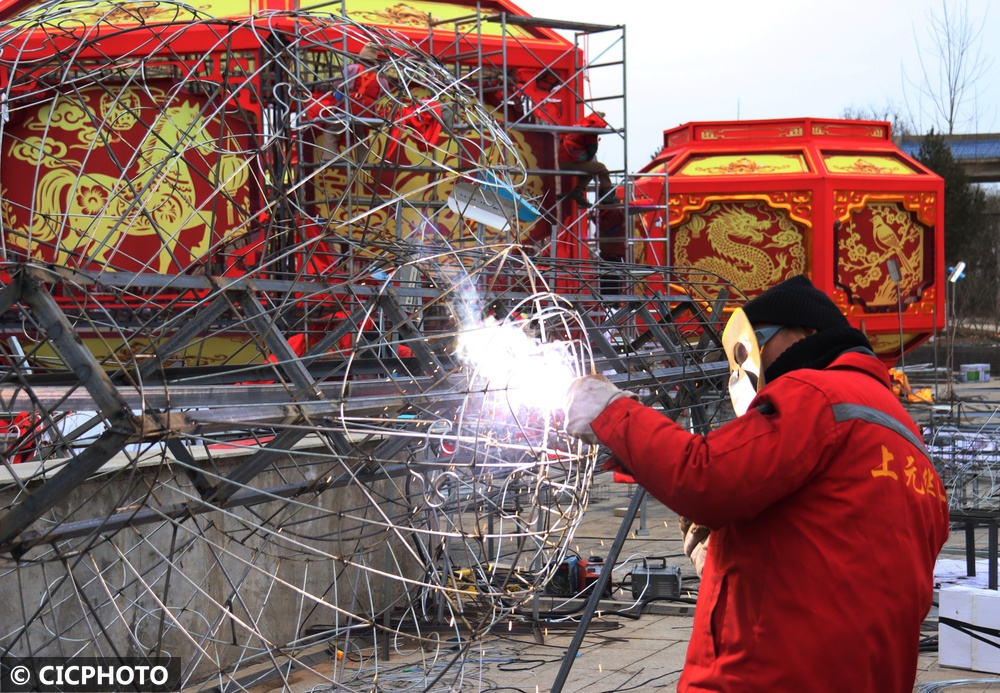 ↑2025年12月21日,工人在河南省三门峡市陕州地坑院景区制作大型彩灯。CICPHOTO/刘肖坤 摄