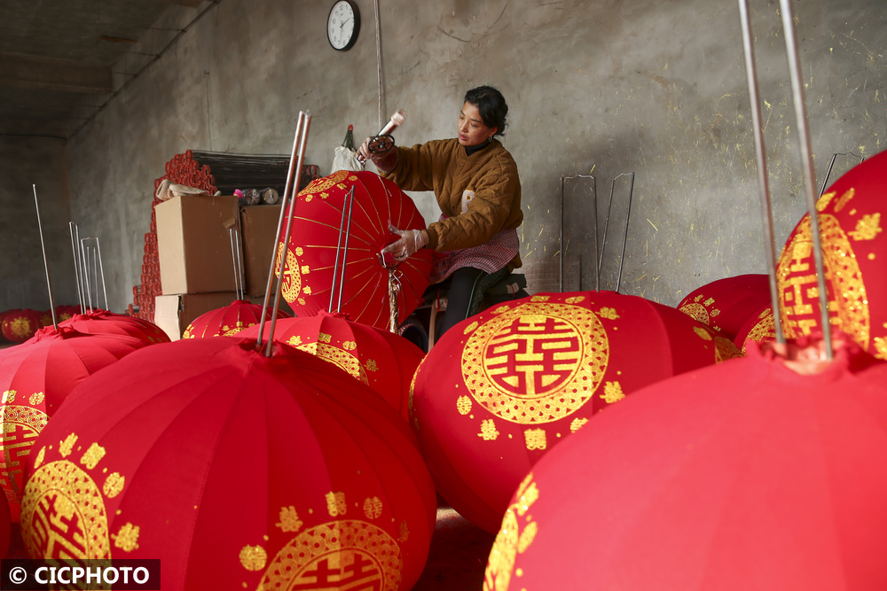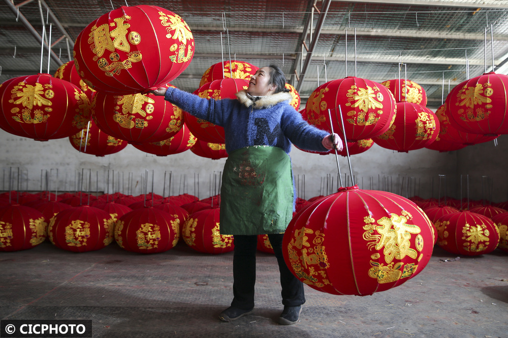 ↑2025年12月5日,山西省运城市稷山县稷峰镇杨赵村灯笼产业园的工人在制作灯笼。CICPHOTO/史云平 摄