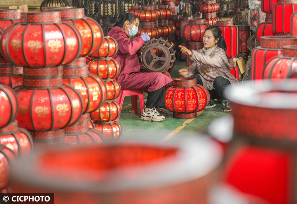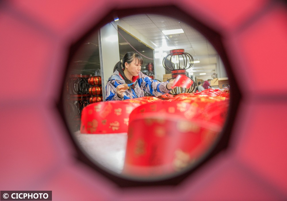 ↑2025年12月23日,湖南省永州市道县高新技术产业开发区一家灯笼加工厂的工人在制作灯笼。CICPHOTO/蒋克青 摄