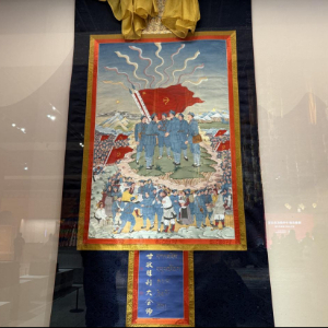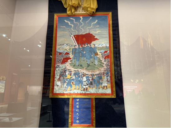 四川省甘孜藏族自治州炉霍县,地处青藏高原东缘的康巴腹地,曾是茶马古道上的重要枢纽,也是具有光荣革命传统的老区。这里多民族聚居,各民族在长期交往交流交融中,孕育出以“精微入圣”闻名遐迩的郎卡杰唐卡艺术。1936年,红军长征途经此地,当地军民团结一心,共同书写了壮丽的革命史诗。郎卡杰唐卡作为国家级非物质文化遗产,以其独特的矿物颜料和精微透视技法独树一帜。展览借助郎卡杰画派匠人的精湛笔触,艺术地重构了藏族同胞支援红军、汉藏军民团结互助的历史场景,让观众在欣赏艺术的同时,感受到那段波澜壮阔的历史。