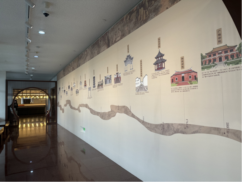 展览还设置多媒体展项:“书院传道”利用LED屏展示杏坛讲学、庐山白鹿洞书院缘起、嵩阳书院二程讲学、鹅湖之会等代表性的场景;“书院四季”运用投影打造裸眼3D的沉浸式空间,通过晨读、会讲、祭祀、藏书刻书四大场景,再现古代书院的鲜活图景;展览中还设置了“书院漫游”实景VR体验区,参观者通过VR眼镜,沉浸式游览岳麓书院。