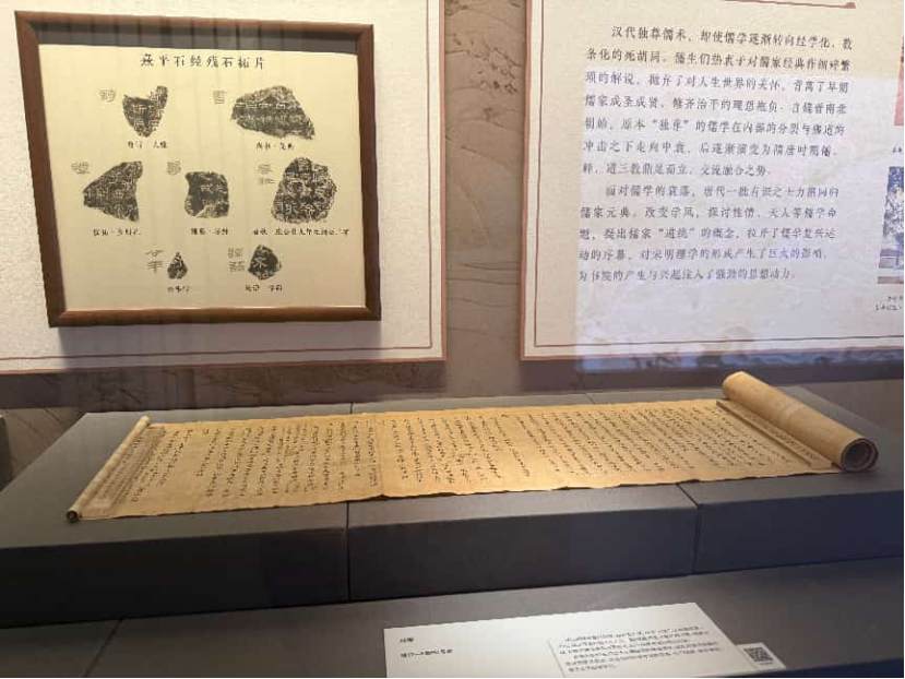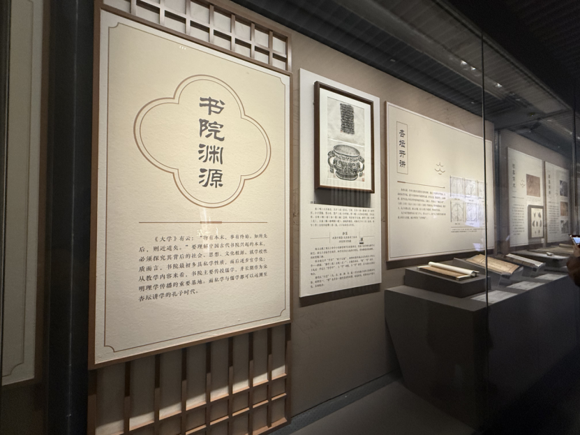 展览展出珍贵展品110余种,利用甲骨、石刻、古写本、金石拓片、善本古籍、书板等多种类型展品,立体呈现书院文化。包括:学者考述商代教育的代表甲骨之一——“教戍”甲骨,熹平石经《论语》残石,唐代科举考试的对策范本集——唐(7—8世纪)写本《对策》(敦煌遗书),收录有《白鹿洞书院记》的宋嘉泰四年(1204)吕乔年刻元明递修本《东莱吕太史文集》,宋刻本《晦庵先生语录大纲领》,明嘉靖三十一年(1552)孔承业刻本《阙里志》,清道光九年(1829)广东学海堂刻咸丰十一年(1861)劳崇光补刻本《皇清经解》,1938年延安解放社出版的《论新阶段》等。