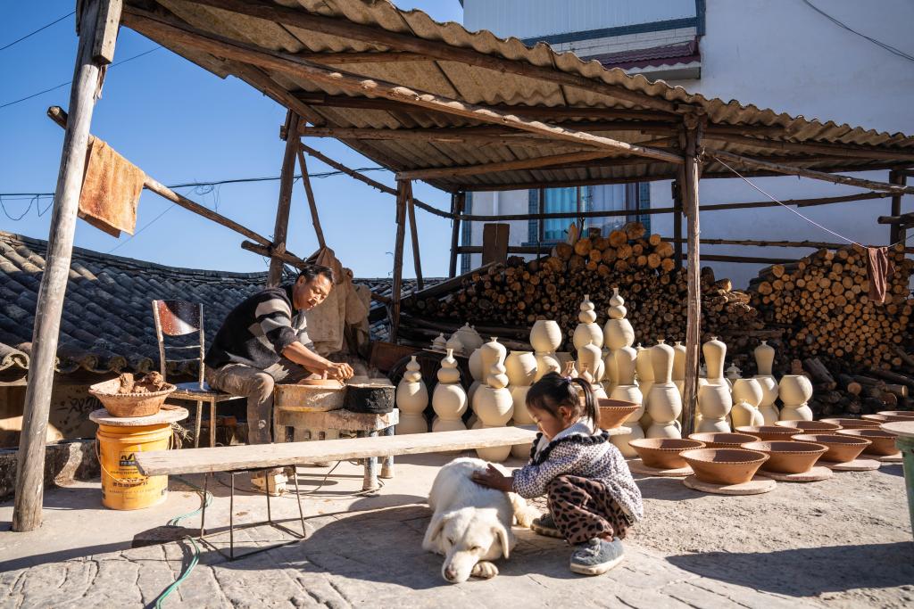 1月22日,村民在云南省临沧市碗窑村查看其制作的陶器。