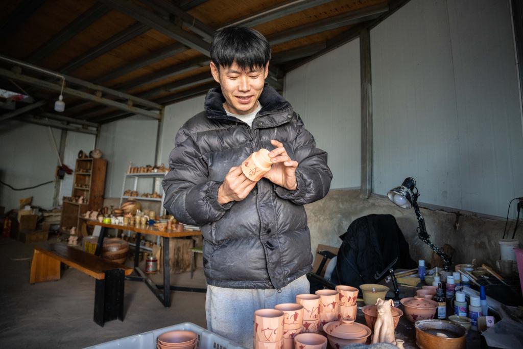 1月22日,村民在云南省临沧市碗窑村展示其制作的带有沧源崖画元素的陶器。