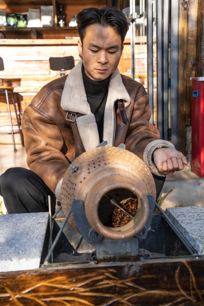 1月22日,咖啡师在云南省临沧市碗窑村一家咖啡店利用陶罐烘焙咖啡,制作“土陶咖啡”。