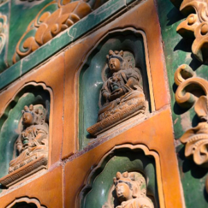这是1月22日拍摄的三覆檐歇山琉璃阁外立面上的无量寿佛琉璃像。